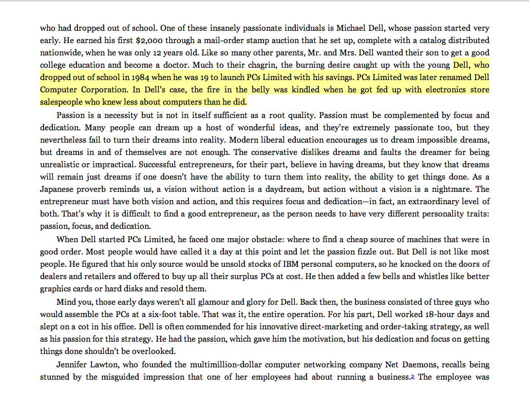 “Dell . . . dropped out of school in 1984 when he was 19 to launch PCs Limited with his savings. PCs Limited was later renamed Dell Computer Corporation. In Dell’s case, the fire in the belly was kindled when he got fed up with electronics store salespeople who knew less about computers than he did.”