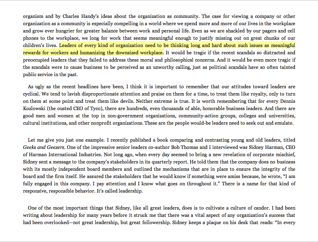 “Leaders of every kind of organization need to be thinking long and hard about such issues as meaningful rewards for workers and humanizing the downsized workplace.”