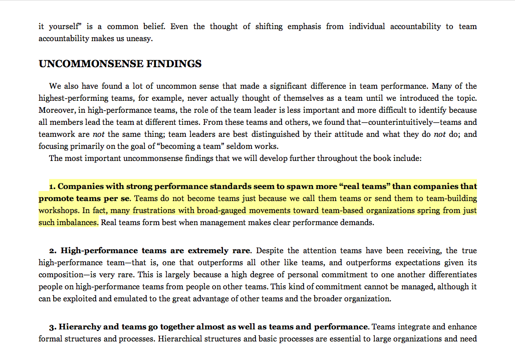 “Companies with strong performance standards seem to spawn more ‘real teams’ than companies that promote teams per se. Teams do not become teams just because we call them teams or send them to team-building workshops. In fact, many frustrations with broad-gauged movements toward team-based organizations spring from just such imbalances.”