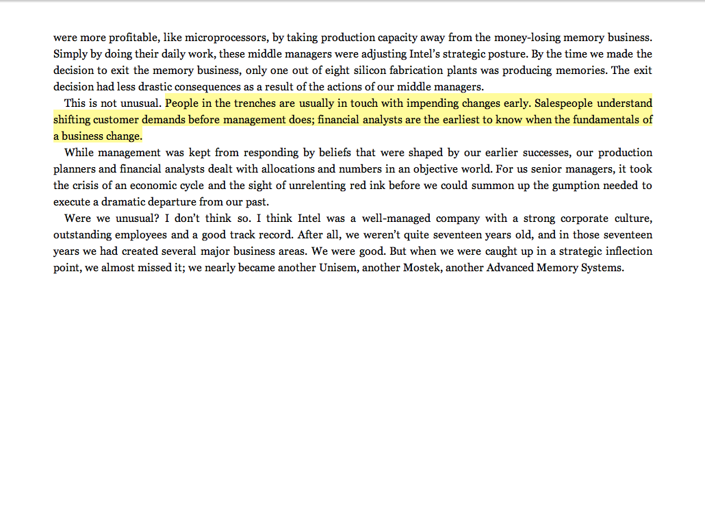 “People in the trenches are usually in touch with impending changes early. Salespeople understand shifting customer demands before management does; financial analysts are the earliest to know when the fundamentals of a business change.”