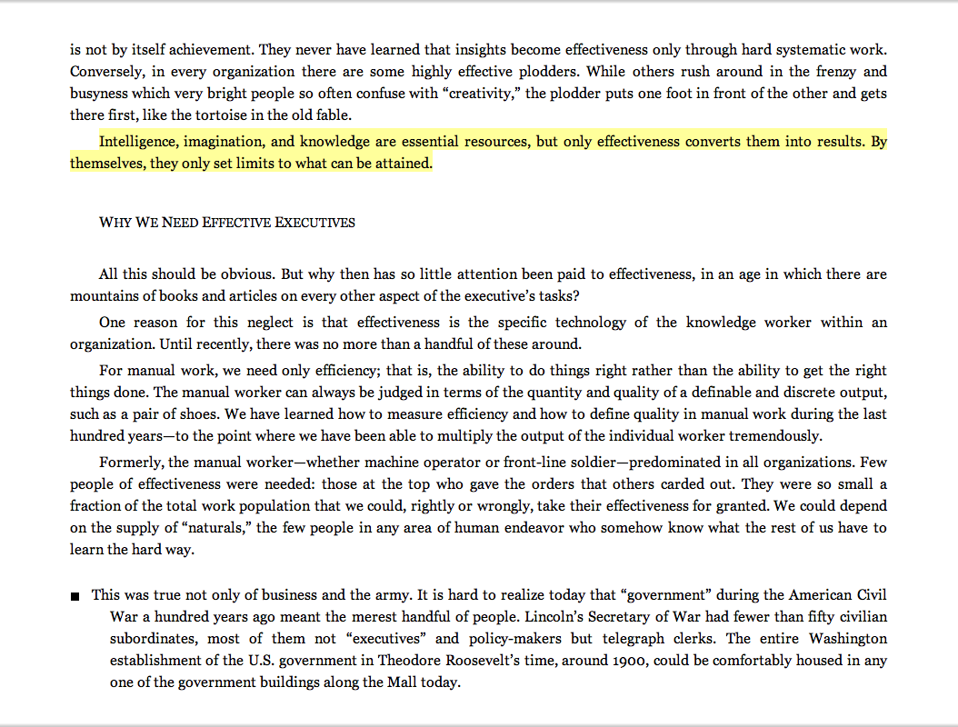 “Intelligence, imagination, and knowledge are essential resources, but only effectiveness converts them into results. By themselves, they only set limits to what can be attained.”