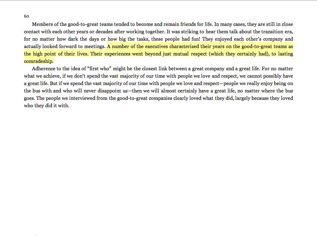 “A number of the [good-to-great] executives characterized their years on the good-to-great teams as the high point of their lives. Their experiences went beyond just mutual respect (which they certainly had), to lasting comradeship.”