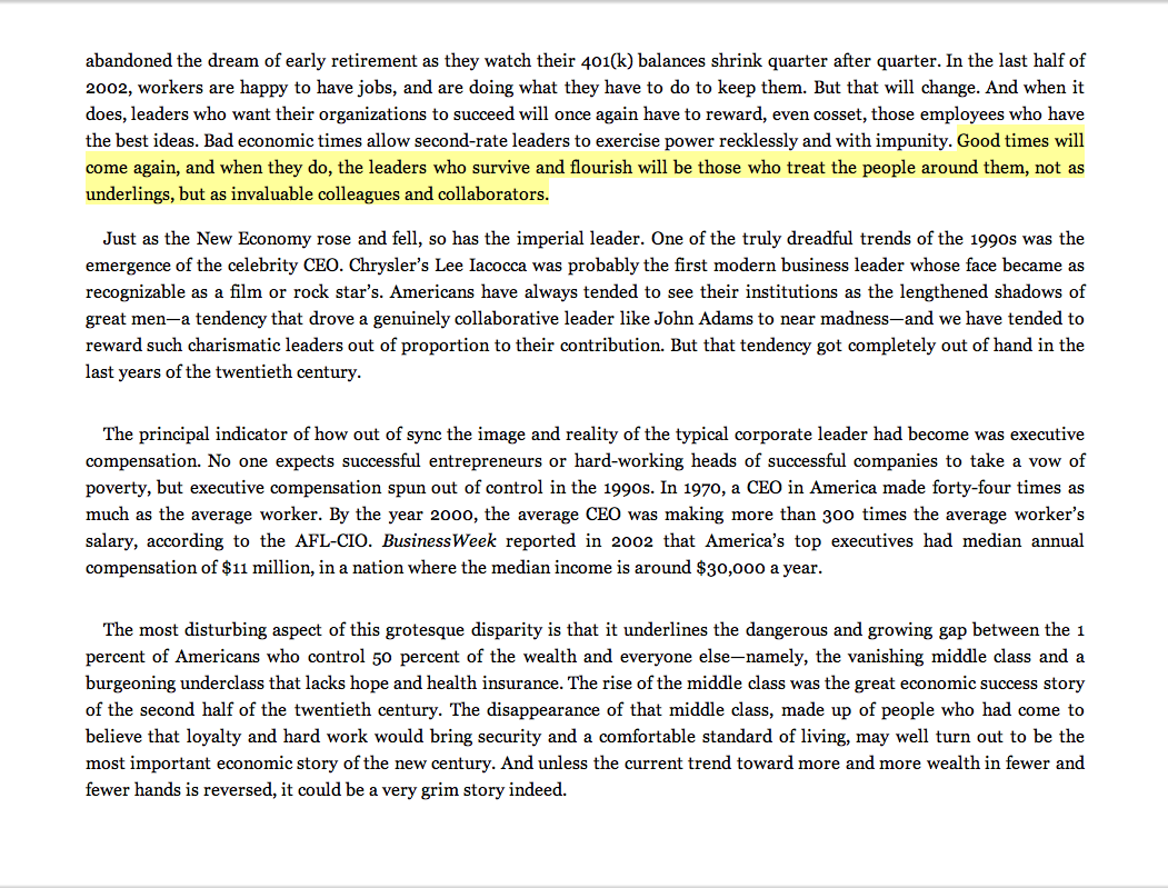 “Good times will come again, and when they do, the leaders who survive and flourish will be those who treat the people around them, not as underlings, but as invaluable colleagues and collaborators.”