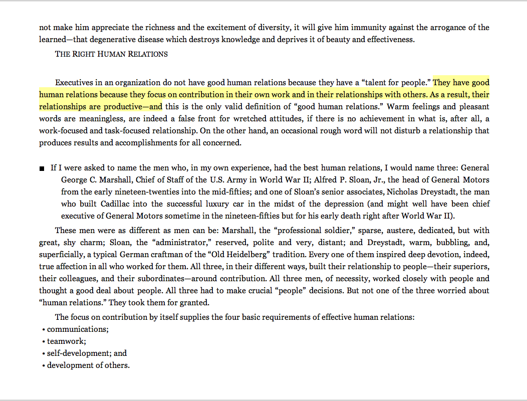 “[Effective executives] have good human relations because they focus on contribution in their own work and in their relationships with others. As a result, their relationships are productive.”