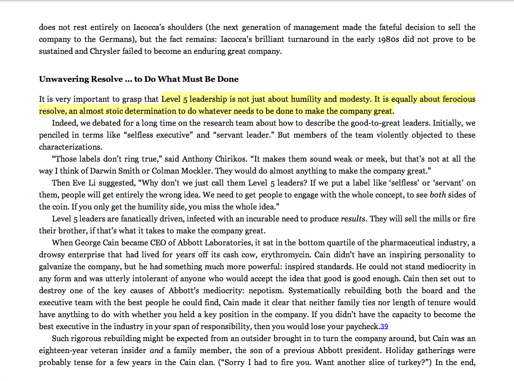“Level 5 leadership is not just about humility and modesty. It is equally about ferocious resolve, an almost stoic determination to do whatever needs to be done to make the company great.”