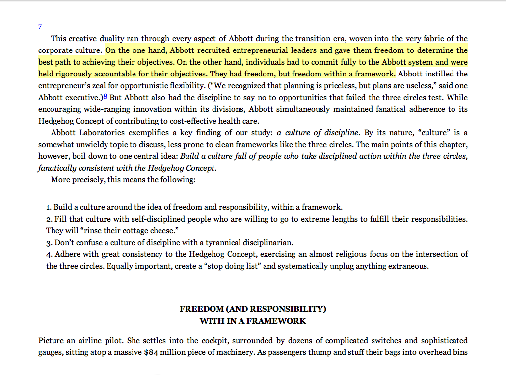 “Abbott [Laboratories] recruited entrepreneurial leaders and gave them freedom to determine the best path to achieving their objectives. On the other hand, individuals had to commit fully to the Abbott system and were held rigorously accountable for their objectives. They had freedom, but freedom within a framework.”