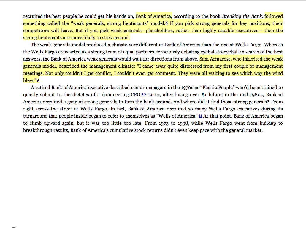 “Bank of America . . . followed something called the ‘weak generals, strong lieutenants’ model. If you pick strong generals for key positions, their competitors will leave. But if you pick weak generals—placeholders, rather than highly capable executives—then the strong lieutenants are more likely to stick around. . . .