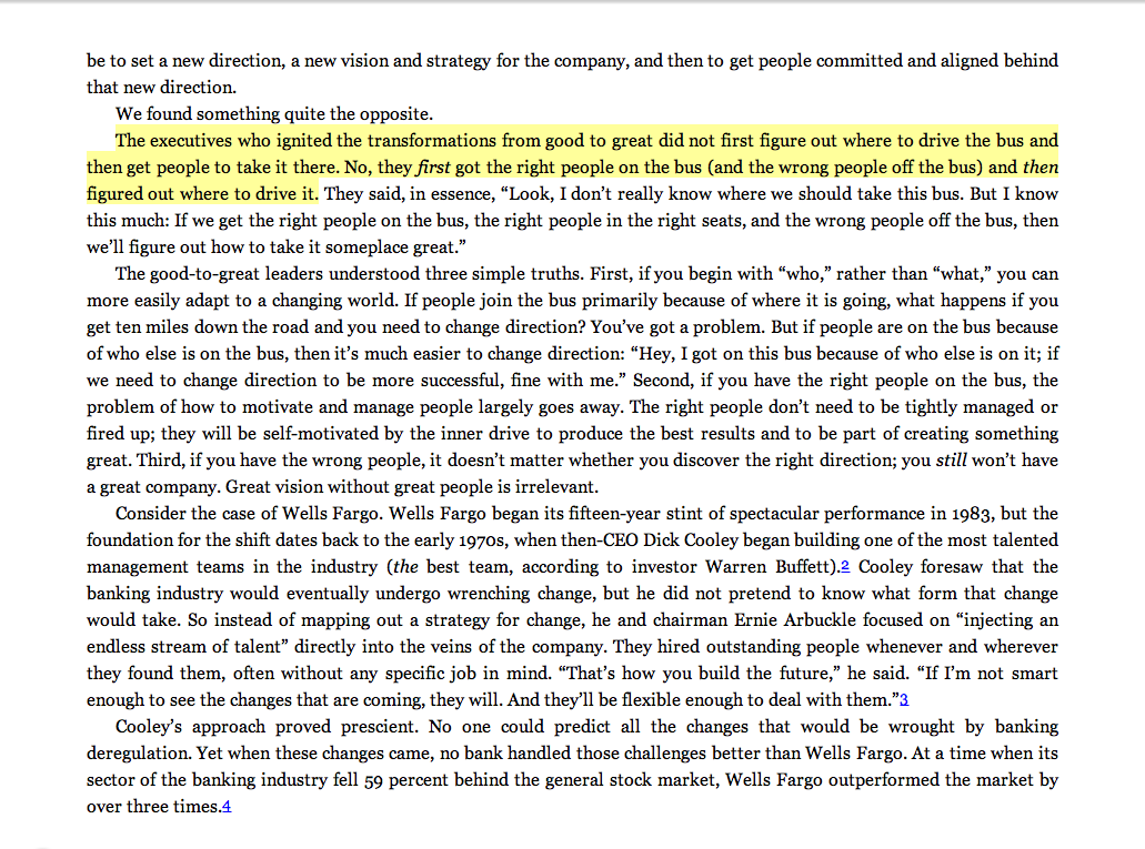 “The executives who ignited the transformations from good to great did not first figure out where to drive the bus and then get people to take it there. No, they first got the right people on the bus (and the wrong people off the bus) and then figured out where to drive it.”