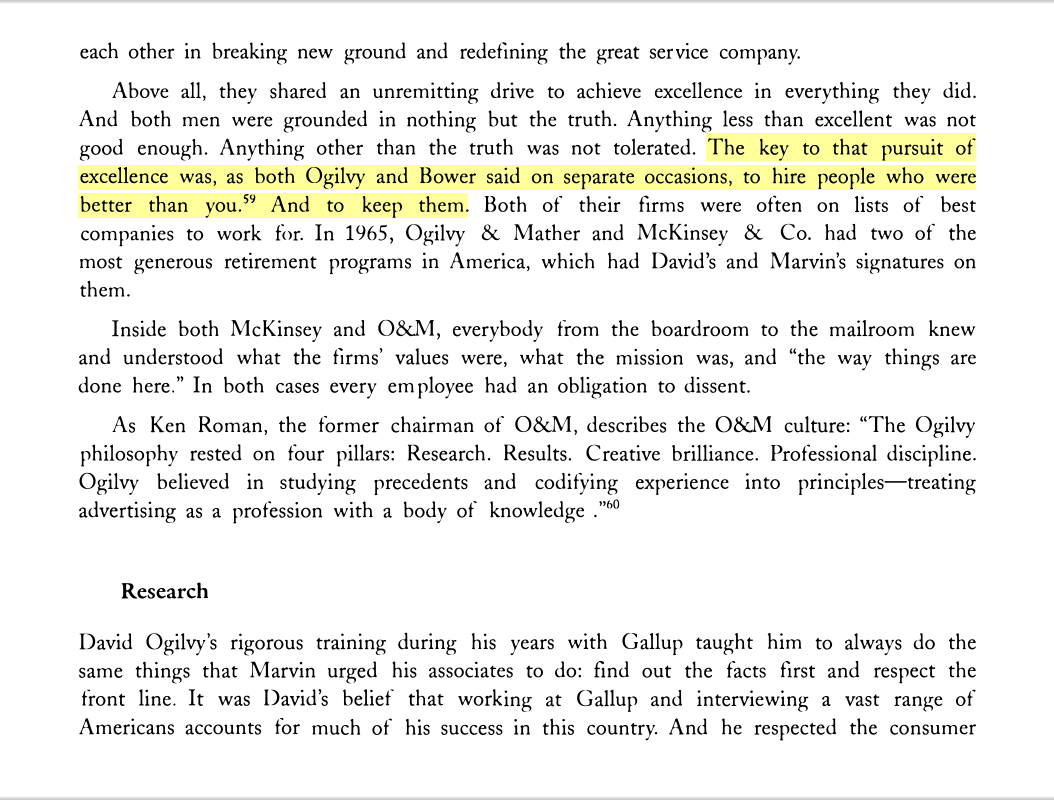 “The key to that pursuit of excellence was, as both [David] Ogilvy and [Marvin] Bower said on separate occasions, to hire people who were better than you. And to keep them.”