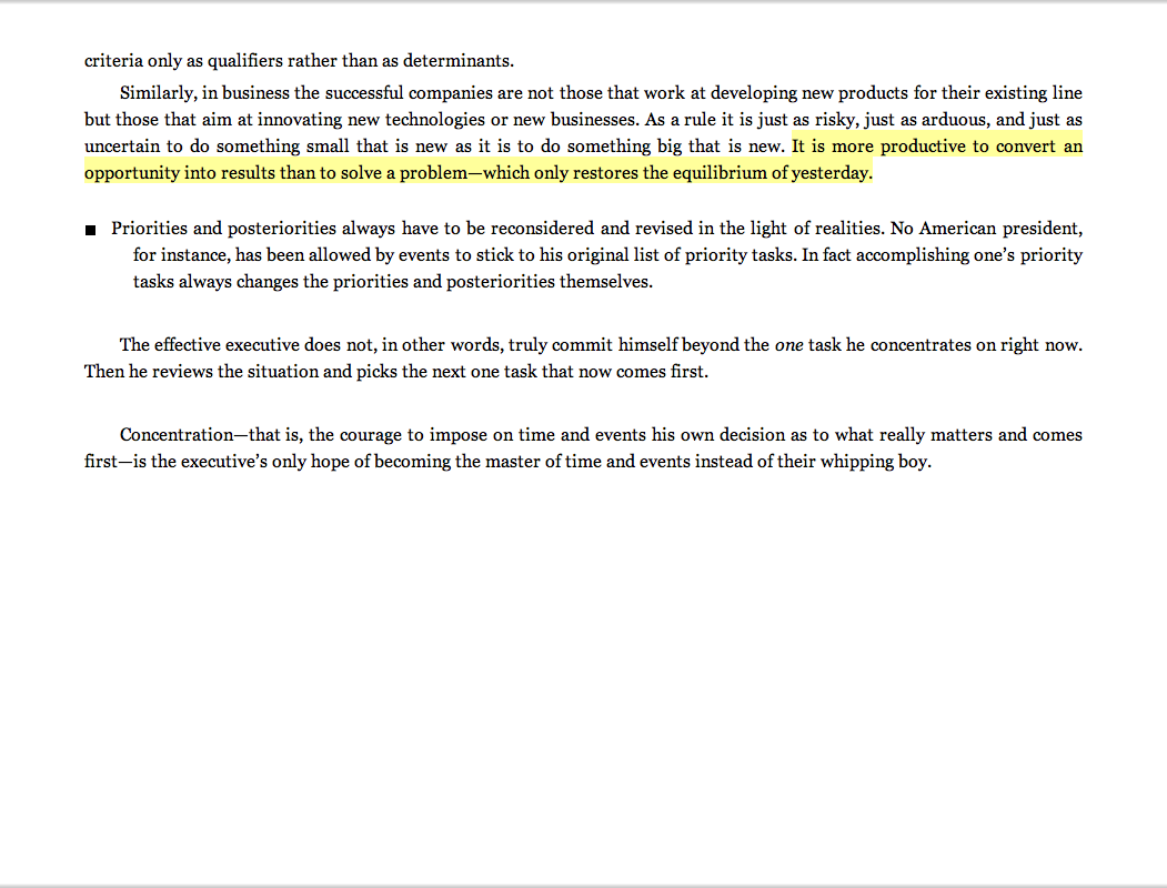 “It is more productive to convert an opportunity into results than to solve a problem—which only restores the equilibrium of yesterday.”