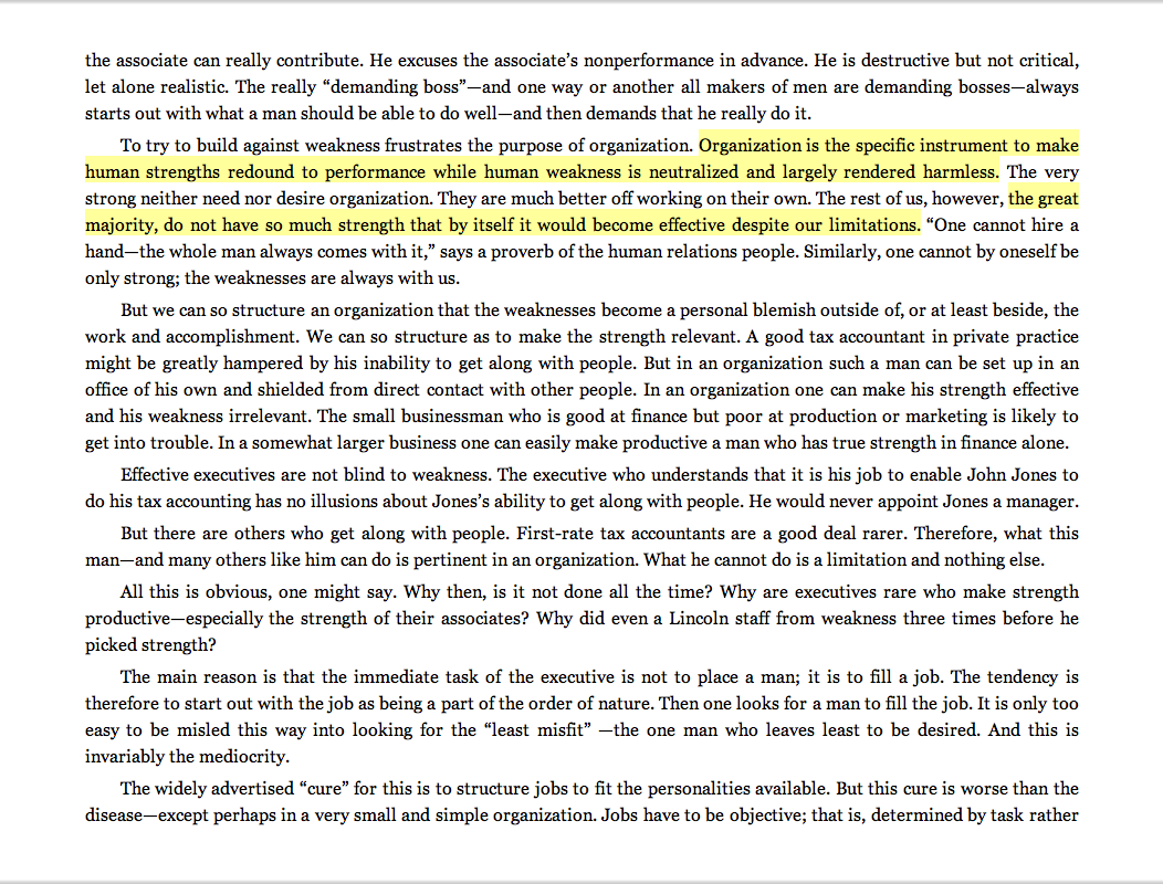 “Organization is the specific instrument to make human strengths redound to performance while human weakness is neutralized and largely rendered harmless. . . . The great majority [of us] do not have so much strength that by itself it would become effective despite our limitations.”