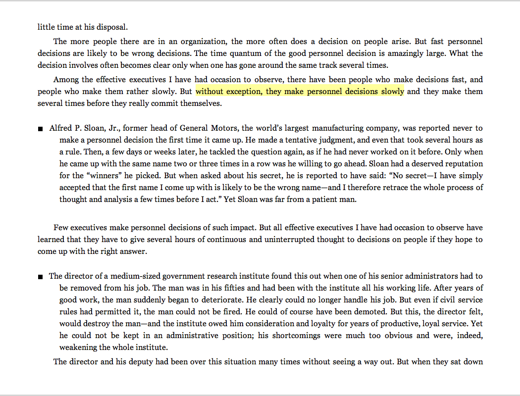“Without exception, [effective executives] make personnel decisions slowly.”