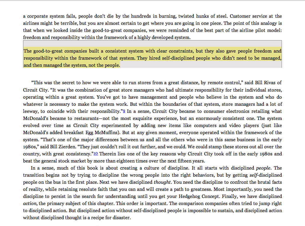 “The good-to-great companies built a consistent system with clear constraints, but they also gave people freedom and responsibility within the framework of that system. They hired self-disciplined people who didn’t need to be managed, and then managed the system, not the people.”