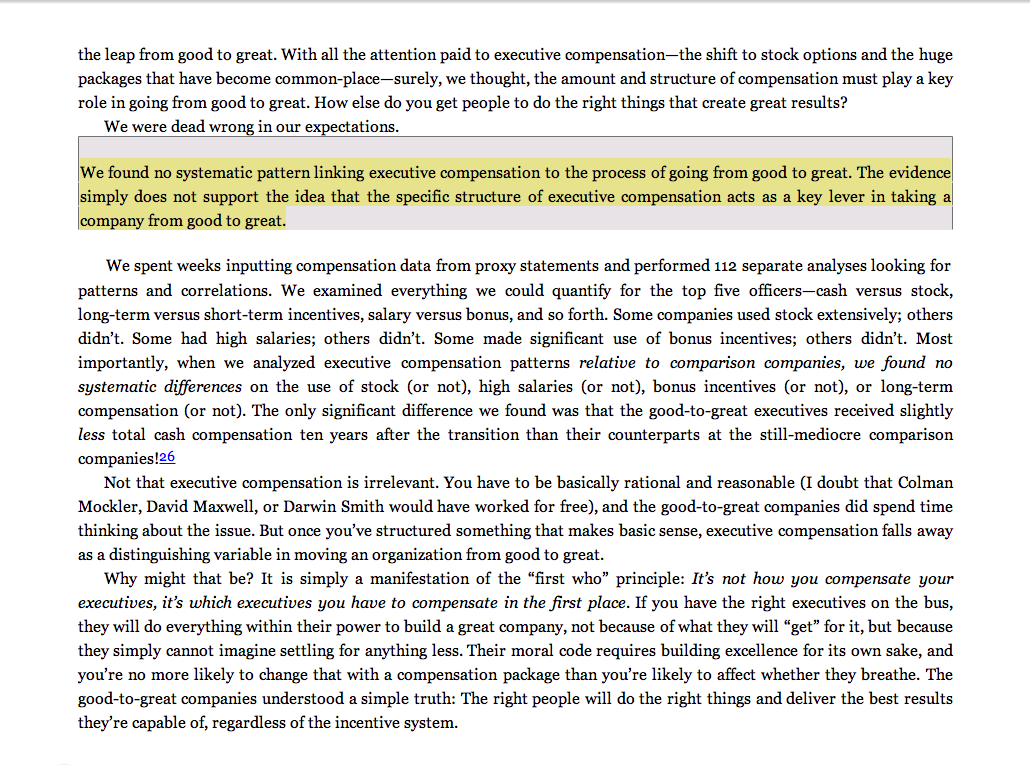“We found no systematic pattern linking executive compensation to the process of going from good to great. The evidence simply does not support the idea that the specific structure of executive compensation acts as a key lever in taking a company from good to great.”