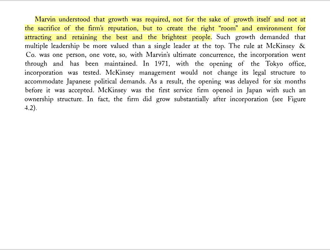 “Marvin [Bower] understood that growth was required, not for the sake of growth itself and not at the sacrifice of the firm’s reputation, but to create the right ‘room’ and environment for attracting and retaining the best and the brightest people.”