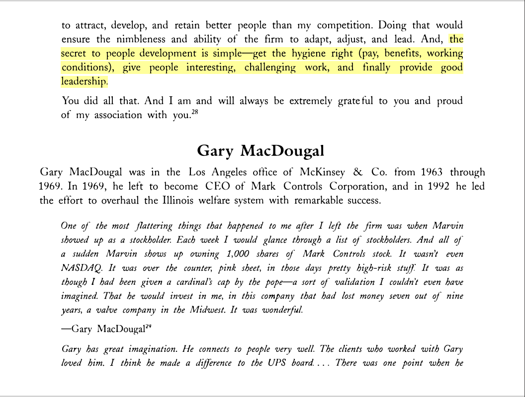 “The secret to people development is simple—get the hygiene right (pay, benefits, working conditions), give people interesting, challenging work, and finally provide good leadership.”