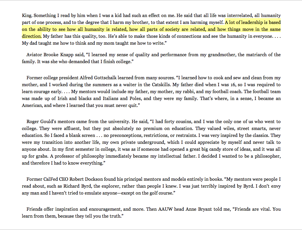 “A lot of leadership is based on the ability to see how all humanity is related, how all parts of society are related, and how things move in the same direction.”