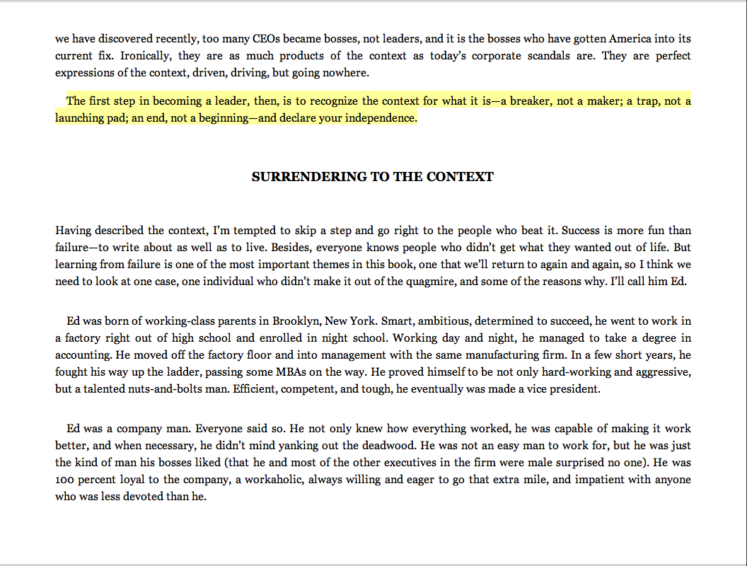 “The first step in becoming a leader, then, is to recognize the context for what it is—a breaker, not a maker; a trap, not a launching pad; an end, not a beginning—and declare your independence.”