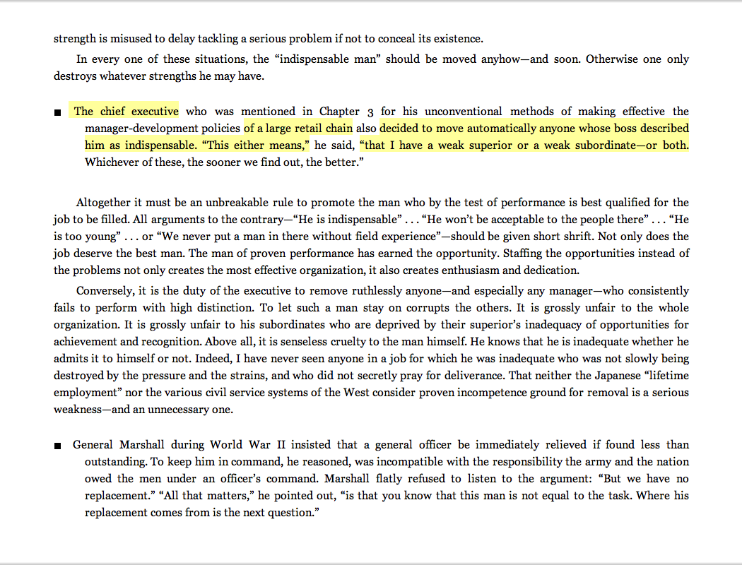 “The chief executive . . . of a large retail chain . . . decided to move automatically anyone whose boss described him as indispensable. ‘This either means,’ he said, ‘that I have a weak superior or a weak subordinate—or both.’ ”