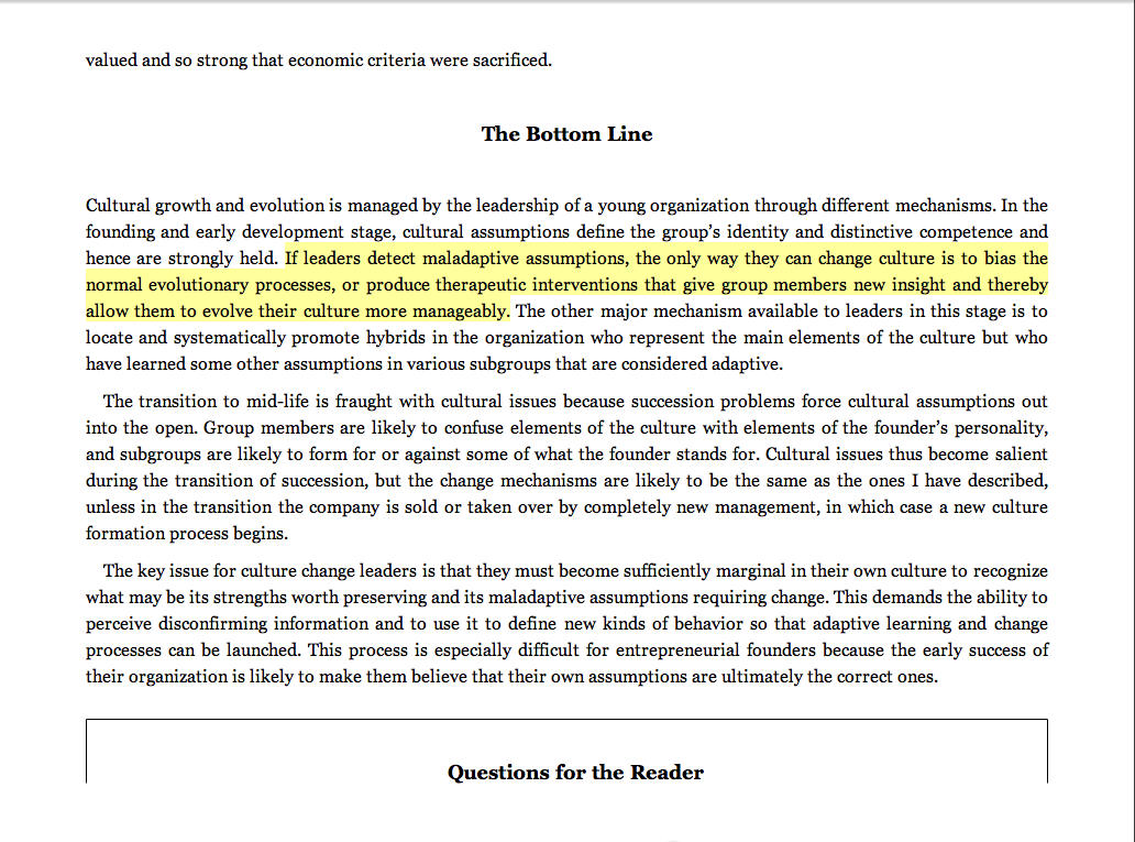 “If leaders detect maladaptive assumptions, the only way they can change culture is to bias the normal evolutionary processes, or produce therapeutic interventions that give group members new insight and thereby allow themselves to evolve their culture more manageably.”