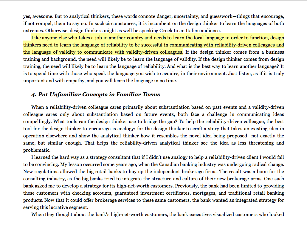 “Like anyone else who takes a job in another country and needs to learn the local language in order to function, design thinkers need to learn the language of reliability to be successful in communicating with reliability-driven colleagues and the language of validity to communicate with validity-driven colleagues.”