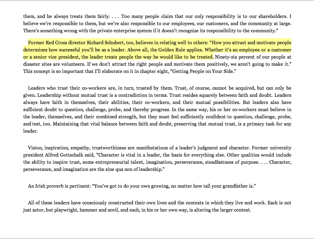 “Former Red Cross director Richard Schubert, too, believes in relating well to others: ‘how you attract and motivate people determines how successful you’ll be as a leader. Above all, the Golden Rule applies. Whether it’s an employee or a customer or a senior vice president, the leader treats people the way he would like to be treated.’”