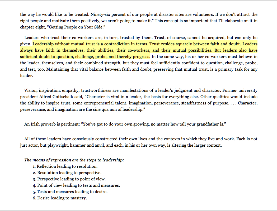 “Leadership without mutual trust is a contradiction in terms. Trust resides squarely between faith and doubt. Leaders always have faith in themselves, their abilities, their co-workers, and their mutual possibilities. But leaders also have sufficient doubt to question, challenge, probe, and thereby progress.”