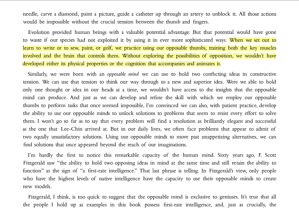 “When we set out to learn to write or to sew, paint, or golf, we practice using our opposable thumbs, training both the key muscles involved and the brain that controls them. Without exploring the possibilities of opposition, we wouldn’t have developed either its physical properties or the cognition that accompanies and animates it.”
