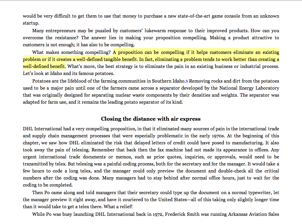 “A proposition can be compelling if it helps customers eliminate an existing problem or if it creates a well-defined tangible benefit. In fact, eliminating a problem tends to work better than creating a well-defined benefit.”